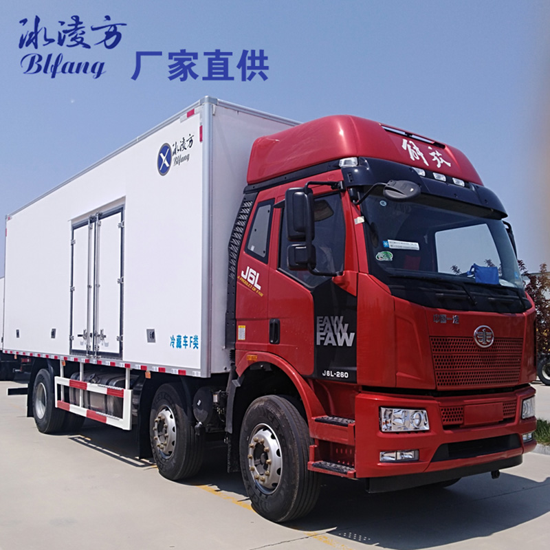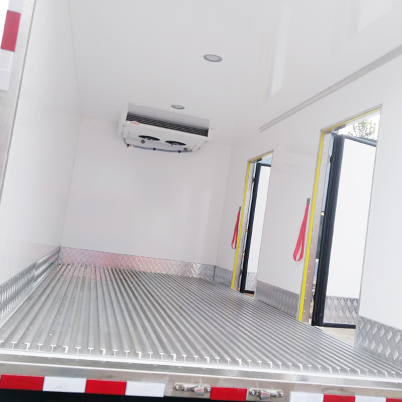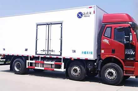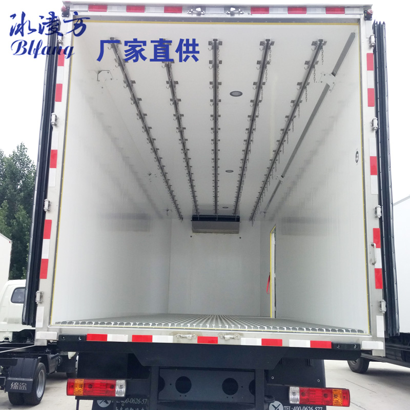 冰凌方冷藏车采用全封闭聚氨酯板块粘接玻璃钢结构,厢体比同类产品轻,能有效的降低运输成本。厢体采用高分子聚酯材料热压成型,采用全封闭结构。一体化的内部加强筋,极大的增加了厢板强度,高强度、高密封性胶合剂,形成一个整体,耐腐蚀性好。采用“三明治”压法,保证厢板内无空气间隙,厢体无金属冷桥,导热率低。