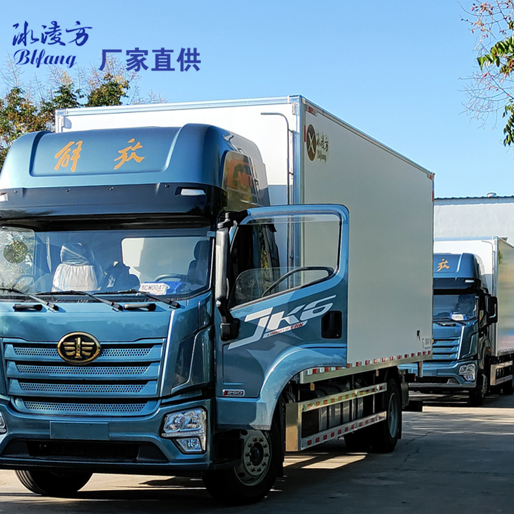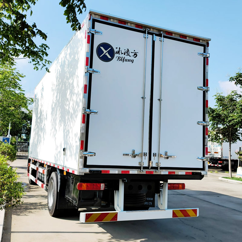 冰凌方冷藏车采用全封闭聚氨酯板块粘接玻璃钢结构,厢体比同类产品轻,能有效的降低运输成本。厢体采用高分子聚酯材料热压成型,采用全封闭结构。一体化的内部加强筋,极大的增加了厢板强度,高强度、高密封性胶合剂,形成一个整体,耐腐蚀性好。采用“三明治”压法,保证厢板内无空气间隙,厢体无金属冷桥,导热率低。
